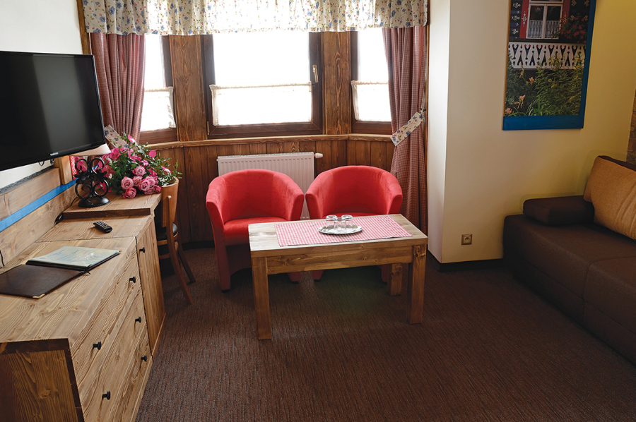 Jedinečný výhľad z balkóna na Belianske Tatry, kúpeľňa so sprchovacím kútom a detailne prepracovaný interiér s množstvom drevených prvkov vzbudzujú pocit tepla a útulnosti, aby ste sa u nás cítili naozaj ako doma. Jedna z týchto izieb je bezbariérová - špeciálne upravená priestranná izba so sprchovacím kútom ponúka komfort aj imobilným hosťom.