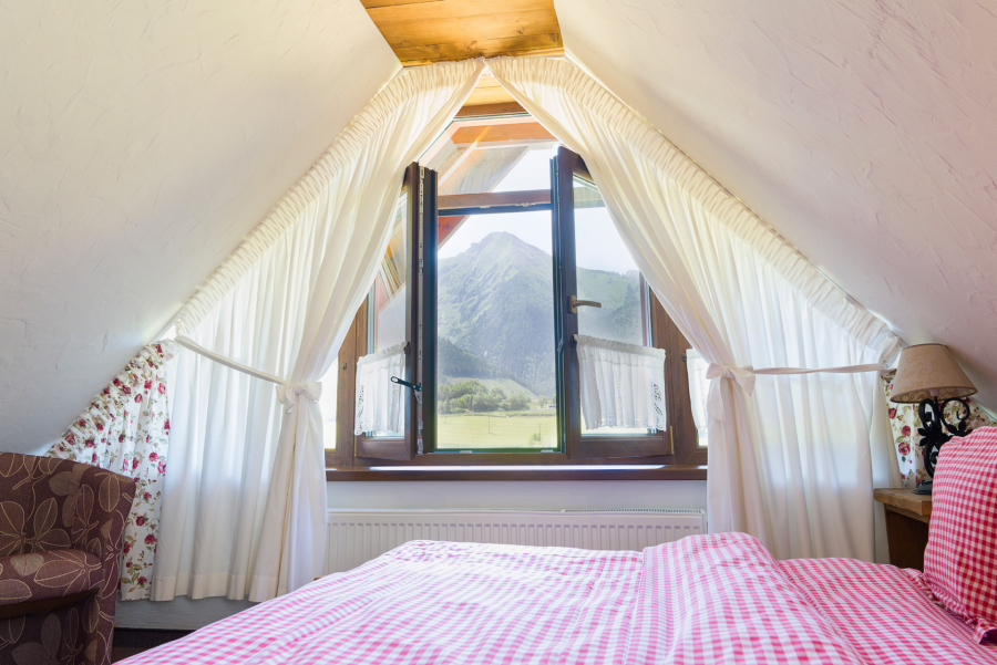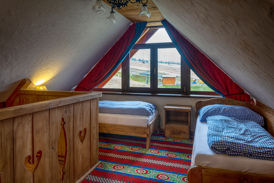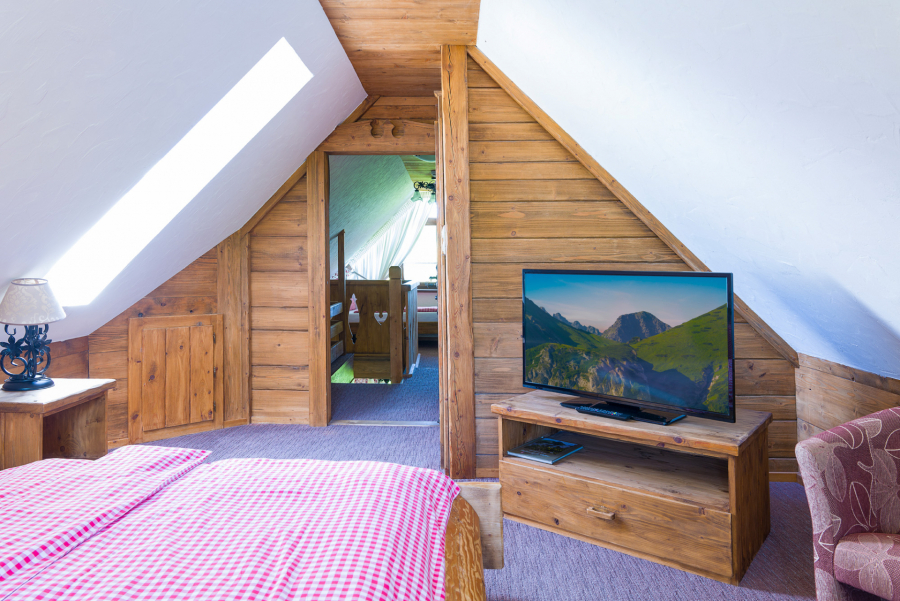 Hlavná spálňa s vlastným TV a toaletou je situovaná v podkroví apartmánu s priamym výhľadom na Tatry. Nad obývacou galériou sú umiestnené dve samostatné lôžka s dostatočným priestorom pre dospelé osoby aj deti, ktoré zaručia nezabudnuteľný zážitok z pobytu u nás.